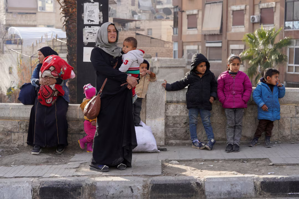 A group of civilians carry bags and belongings as they flee following renewed clashes between the Syrian army and the Syrian Democratic Forces (SDF), in Aleppo, Syria, January 7, 2026.