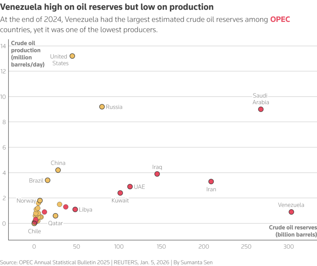 A scatter plot showing crude oil reserves on the horizontal axis and crude oil production on the vertical axis for OPEC and non-OPEC countries at the end of 2024.