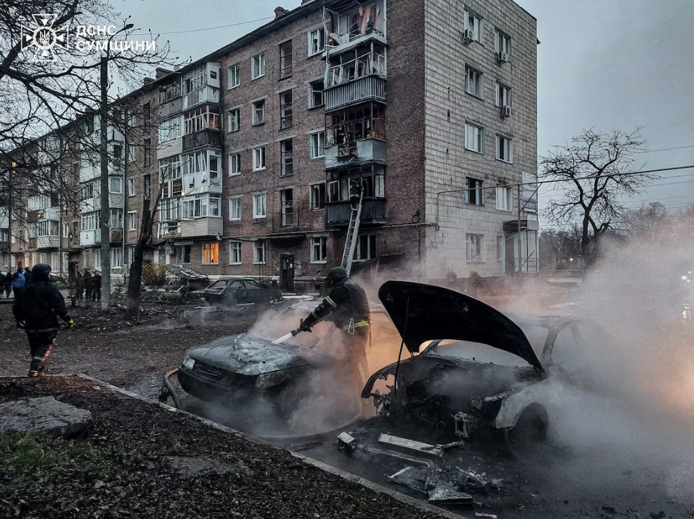 A firefighter works at the site of a Russian drone strike, amid Russia’s attack on Ukraine, near the town of Konotop, Sumy region, Ukraine April 10, 2026.
